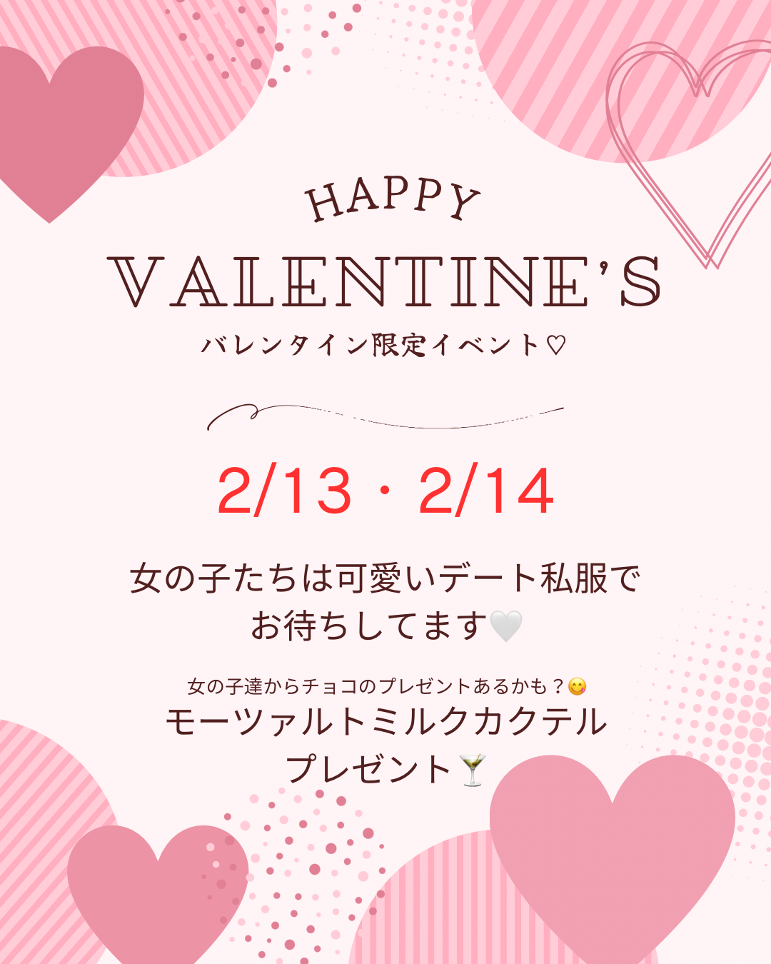 ❣️2月イベントのお知らせ❣️ 2月13日(金)・14日(土)でバレンタインイベント開催︎💕︎︎💕︎ 女の子たちはみんなデート服♡ なかなか見ることの無い、いつもと違った雰囲気で 皆様をお待ちしてます🤍 ご来店されたお客様には、 モーツァルトミルク(チョコリキュールとミルクで割ったカクテル) をプレゼント🍸🎁✨ 女の子たちからもチョコレートもらえちゃうチャンス🍫︎💕︎︎ ぜひ遊びに来てくれたら嬉しいです😍 お待ちしています🎶